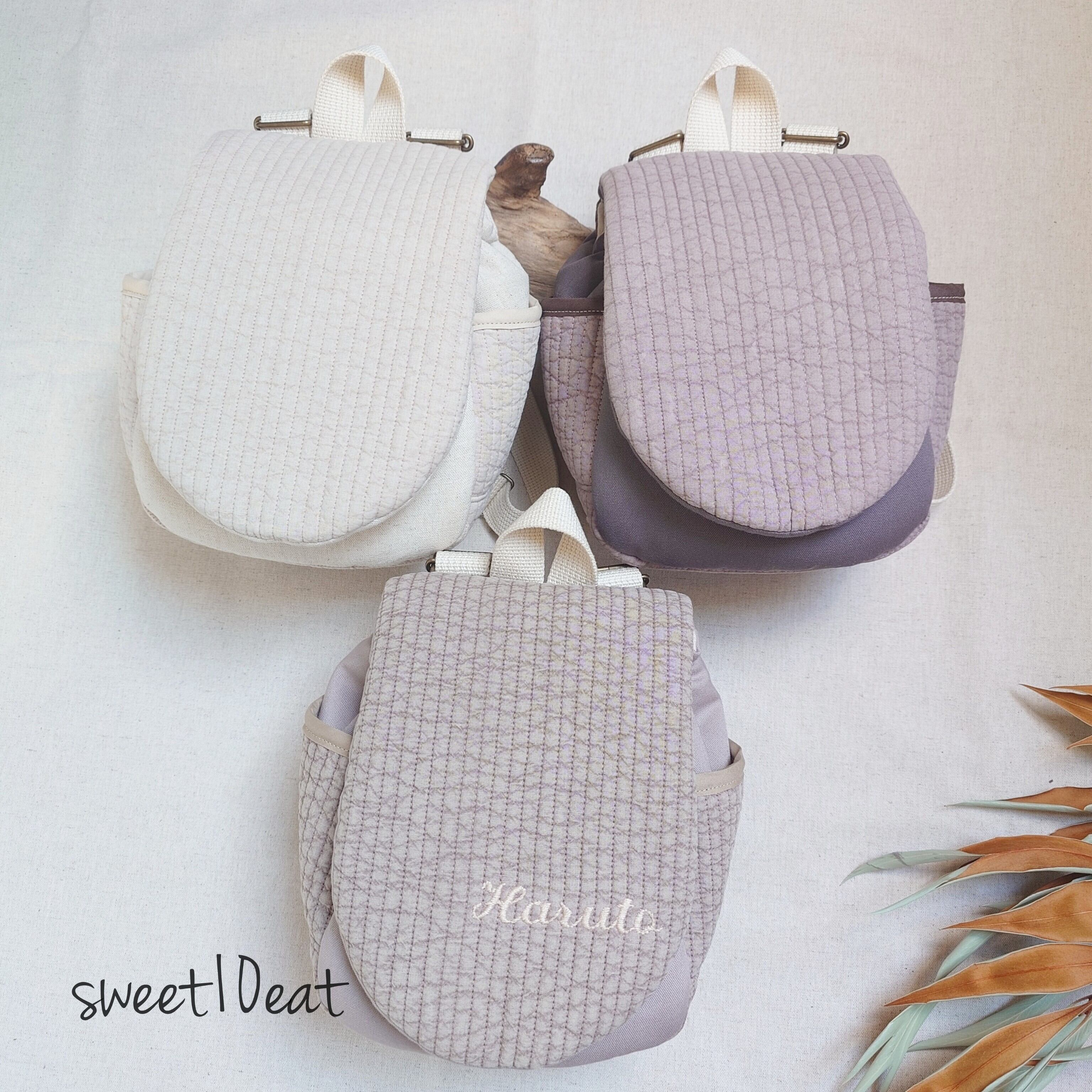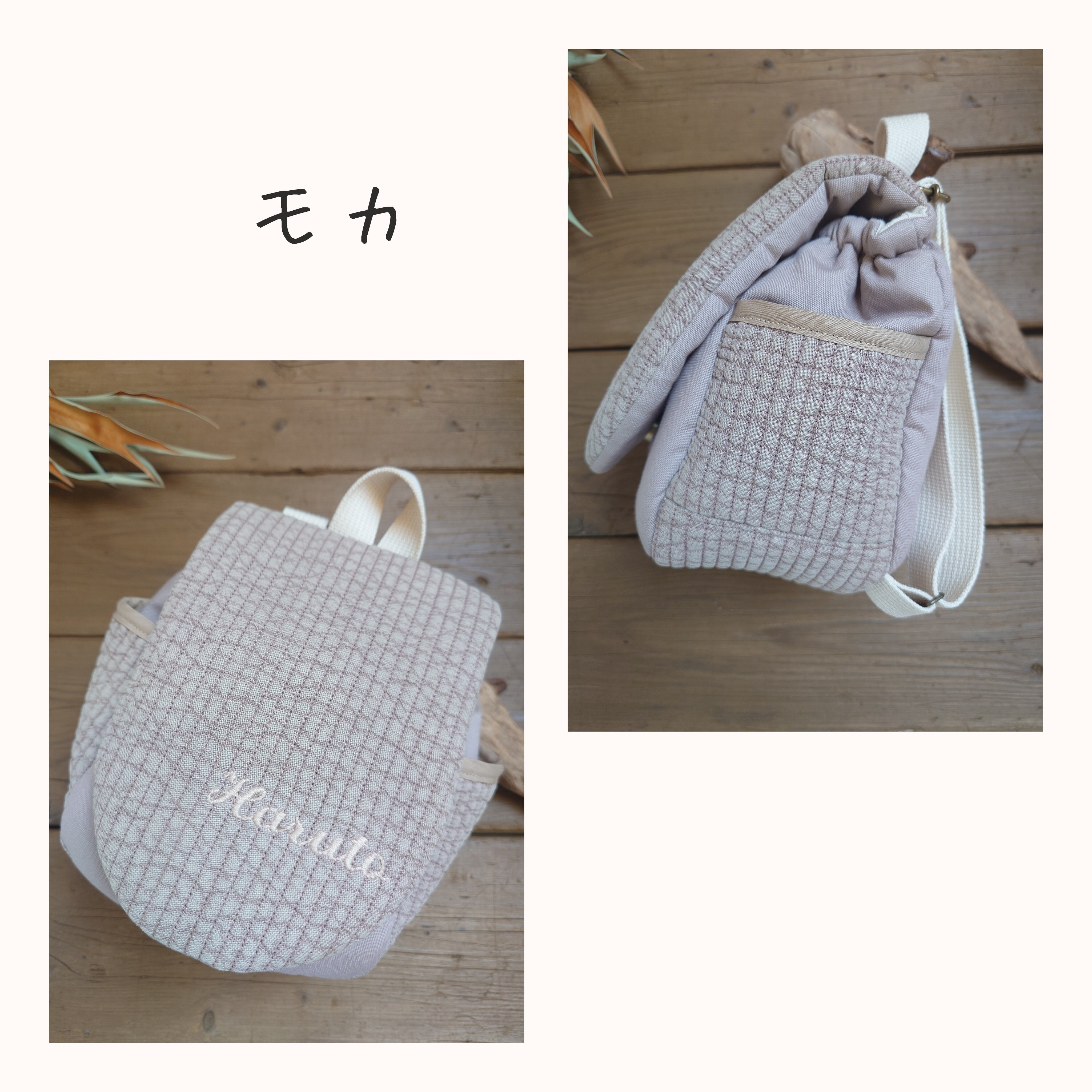 初めてのリュック、出産祝い、お誕生日ギフトにぴったりな世界でひとつだけのお名前刺繍入り、人気のヌビ生地のベビーリュックになります。